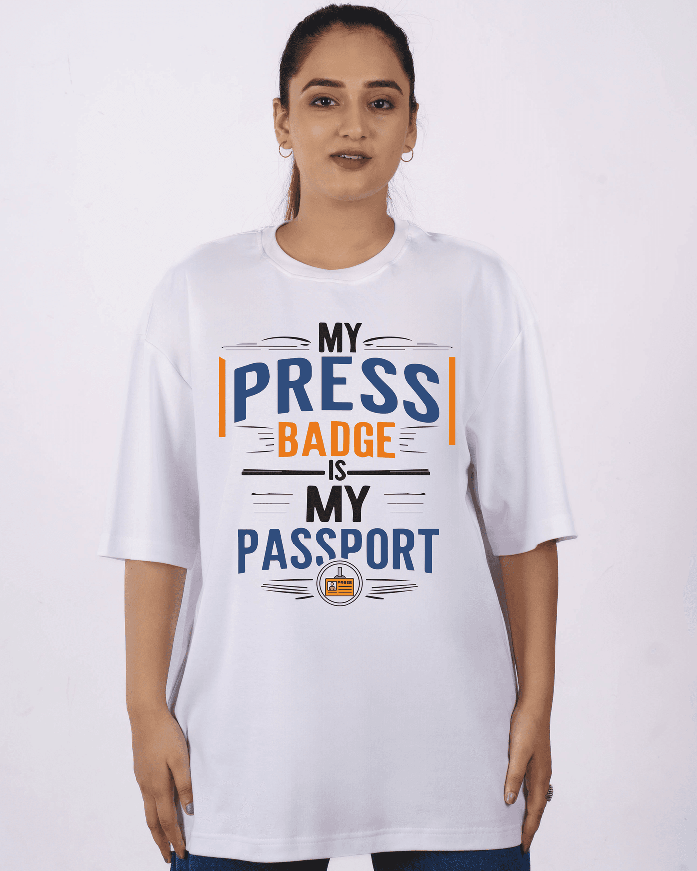 This oversized T-shirt For Women is designed for fearless journalists whose journeys take them into newsrooms, conflict zones, press conferences, and untold stories. Featuring the bold quote “My Press Badge Is My Passport,” this tee celebrates truth-seekers who turn curiosity into impact.