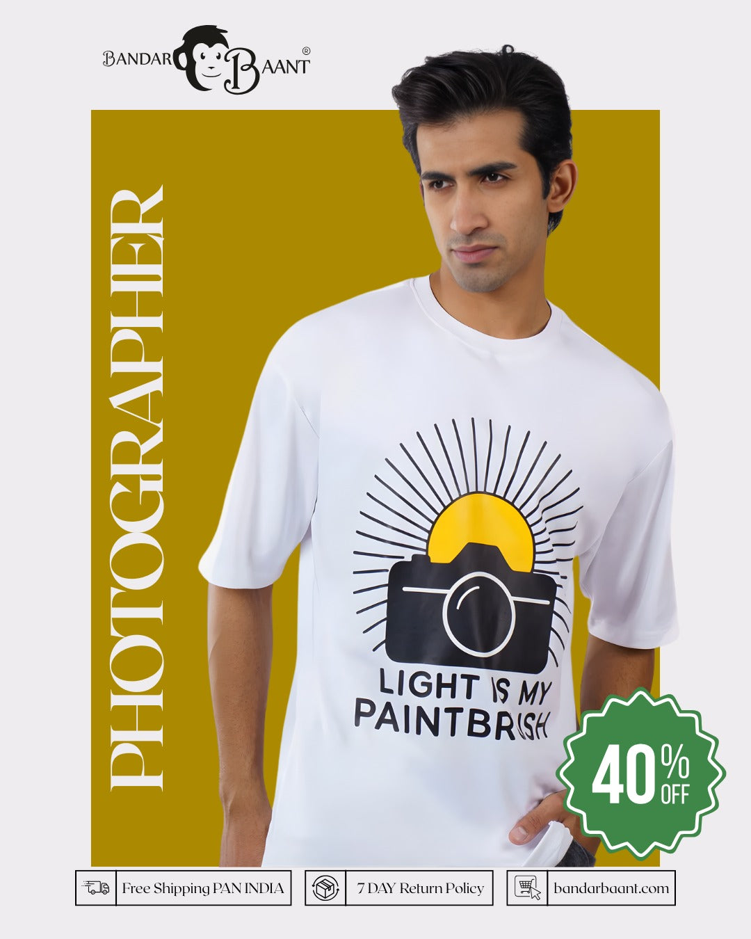 Express your creative vision with this Photographer-themed Printed Tshirt For Men, designed for storytellers who paint with light instead of brushes. The “Light Is My Paintbrush” oversized tee celebrates photography as an art form, where every frame begins with perspective, patience, and passion. This Printed Tshirt For Men speaks directly to professional photographers, hobbyists, and creative souls who see beauty in everyday moments and magic in golden hour.