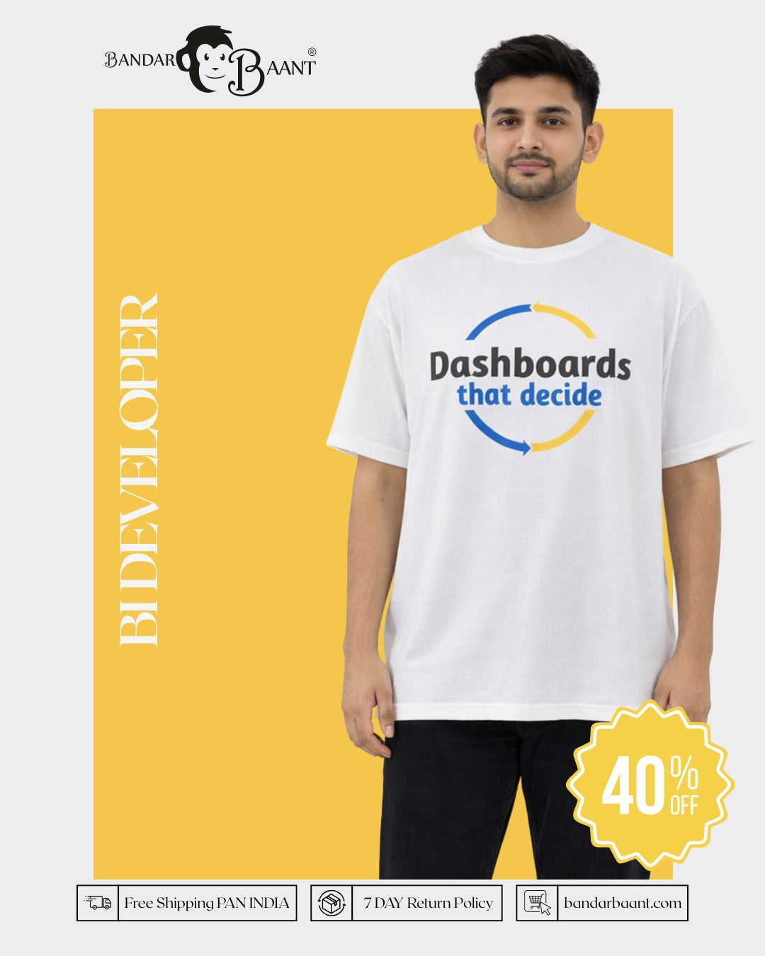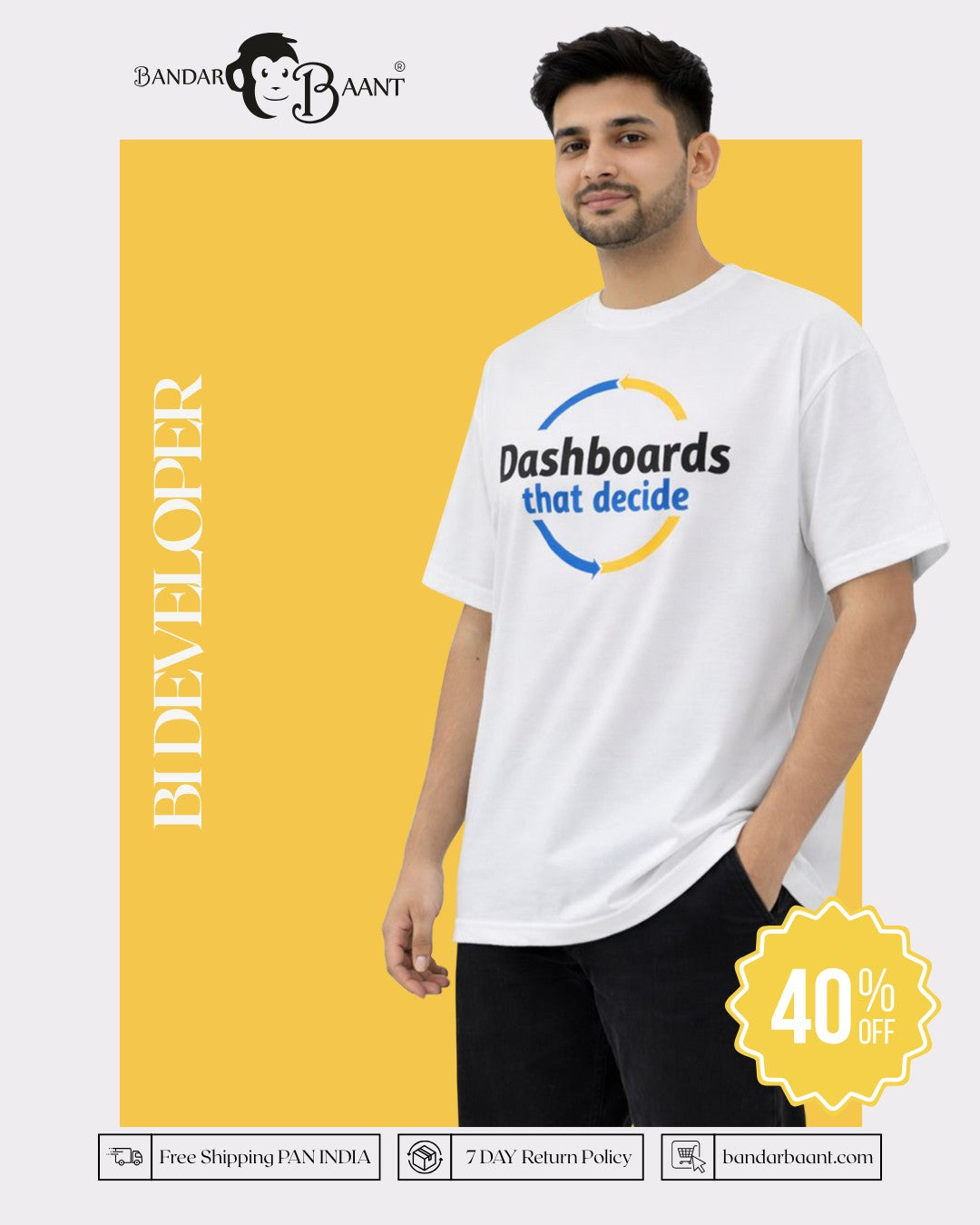 Command decisions with data and style in this oversized T-Shirt For Men design, created for BI Developers, data analysts and decision-makers who turn numbers into strategy. Featuring the sharp statement “Dashboards That Decide”, this T-shirt reflects the power of insights, clarity and impact behind every report and visualization.